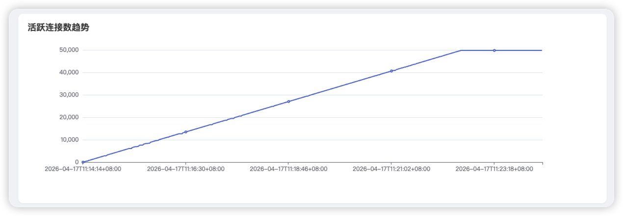 车载监控业务的核心根基是 TCP 长连接常驻,车辆 7×24 小时在线、不间断联网监管,全依赖平台长连接承载能力。从连接数趋势曲线可见:系统以 100 路 / 秒的设定速率平稳爬坡建连,活跃连接数持续线性增长,最终稳稳触达近 5 万终端满额在线;连接数封顶后全程保持平直稳定,无连接断崖、无批量掉线、无内存溢出导致的连接断开,充分验证系统长连接架构的稳定性,完美适配营运车辆、固废运输车辆全天候不间断在线监管需求。