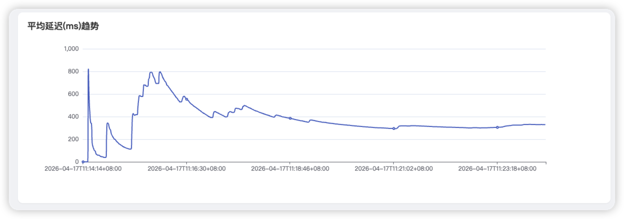 - 满负荷 5 万终端在线阶段,全程稳定在 300ms 左右低延迟区间,无持续走高、无超时堆积、无消息阻塞积压。