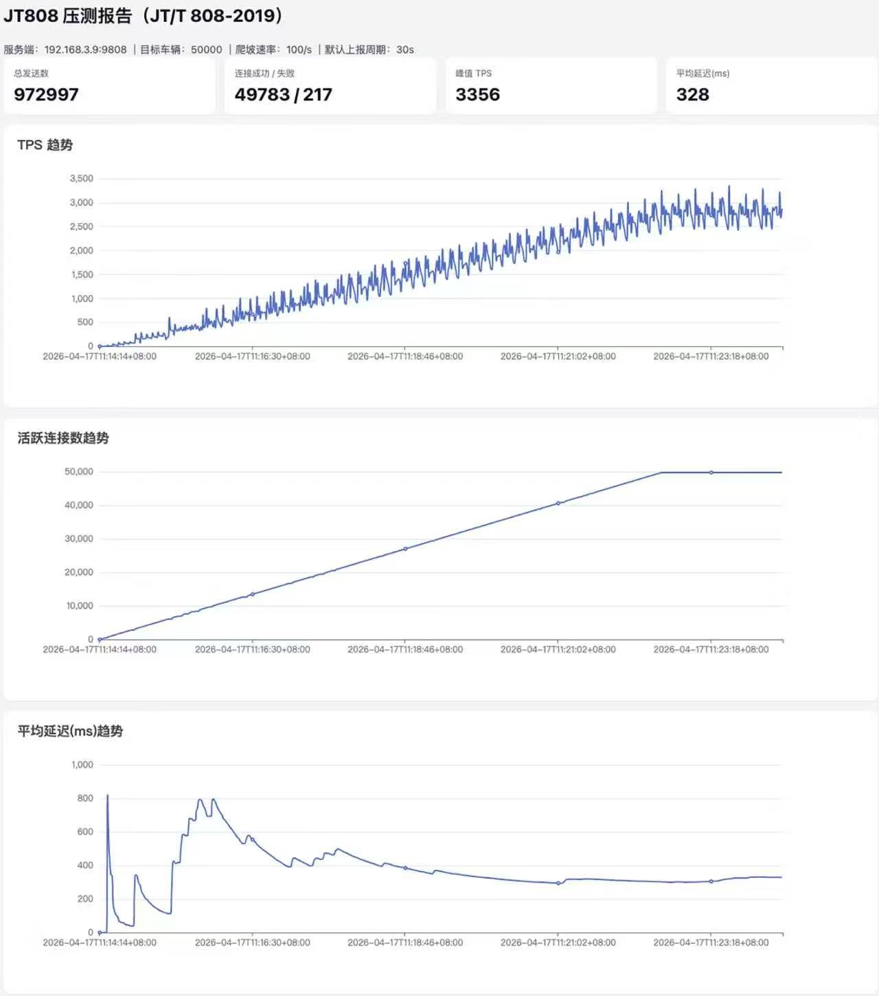 - 峰值业务吞吐 TPS:3356 TPS(代表系统每秒可稳定处理超 3300 条国标 JT808 车载报文,含定位上报、心跳、报警、车辆信息上报等全类型业务消息)